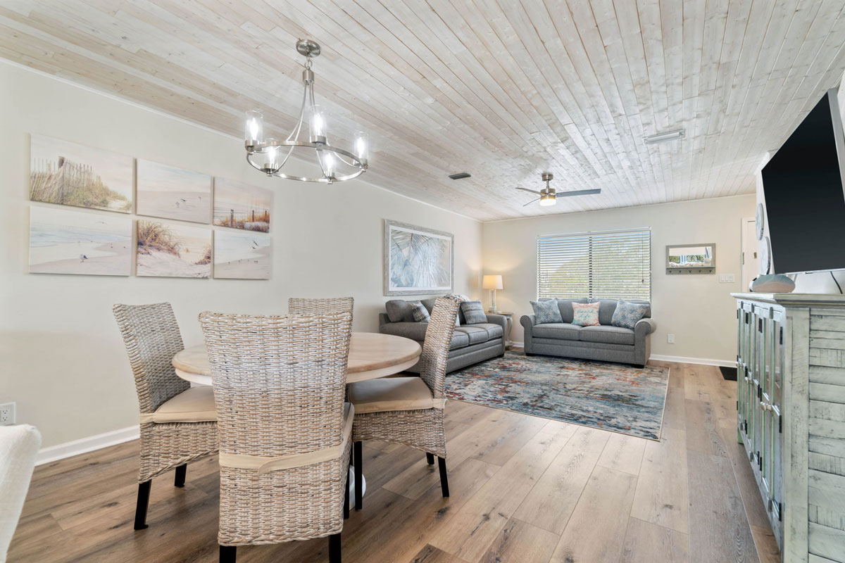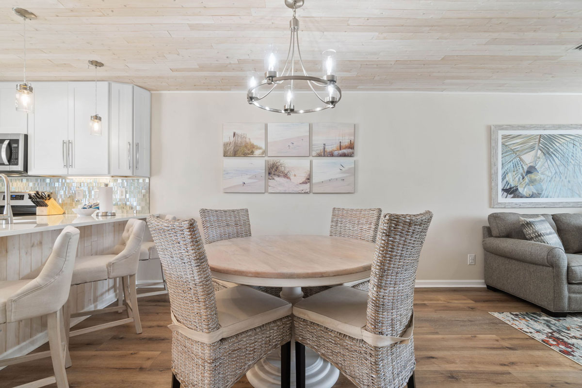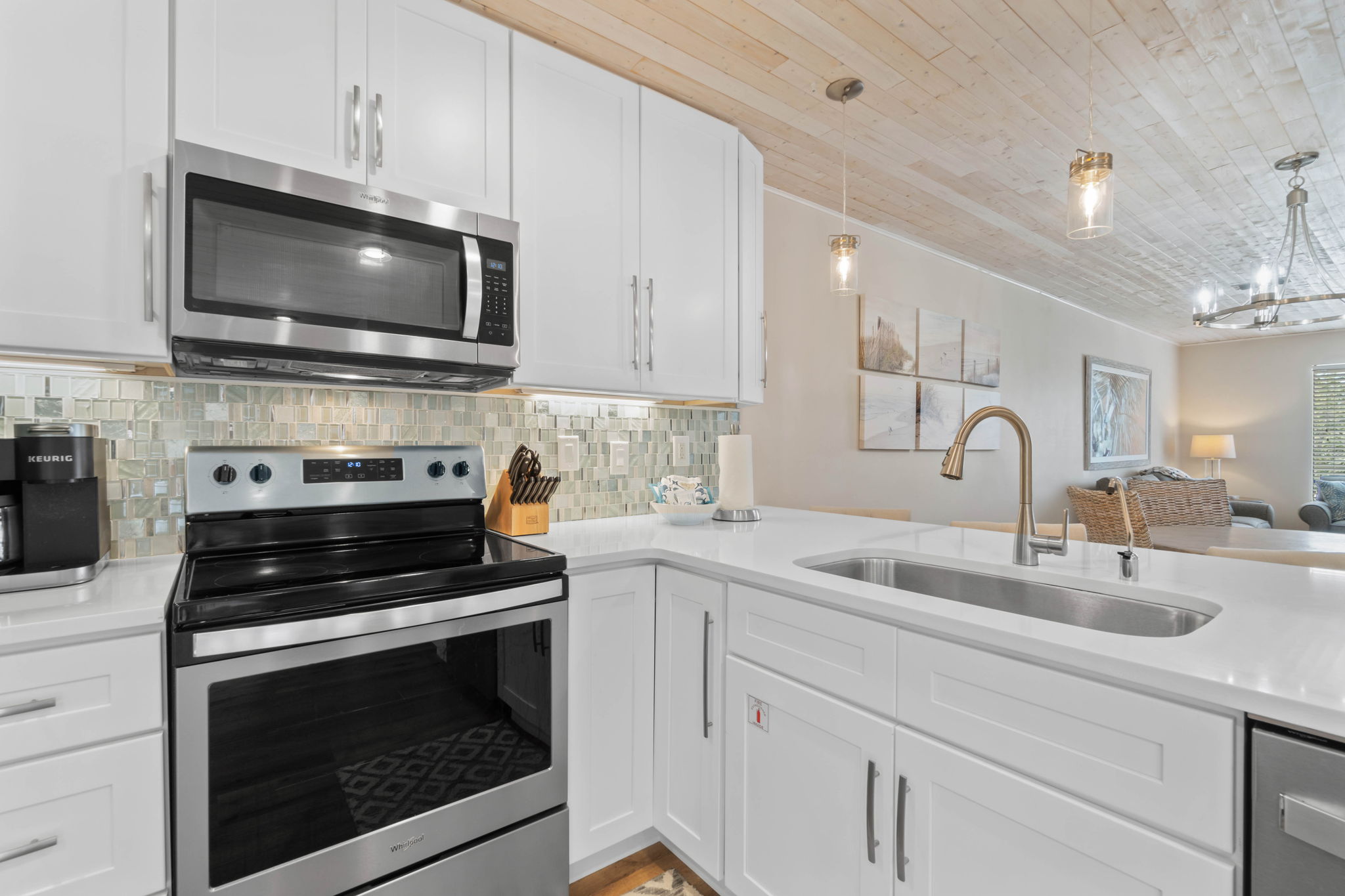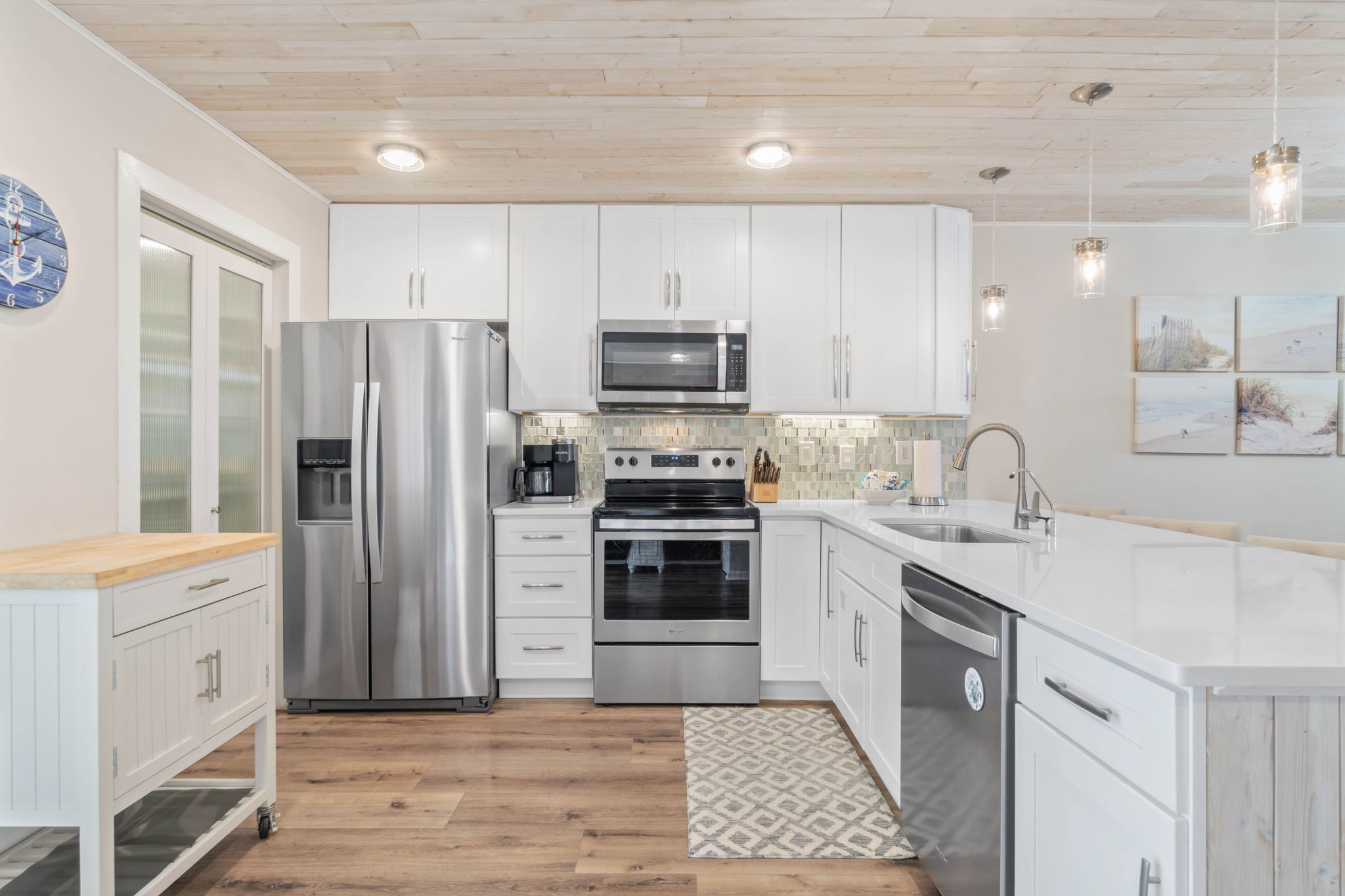 Newly remodeled and newly furnished, this spectacular rental through RRiviera Properties, LLC., features a spacious living and dining area, a full-size washer and dryer, and a fully equipped kitchen with new flooring and updates throughout. New dishware, flatware, cookware, small kitchen appliances, and utensils round out this freshly updated roomy kitchen.